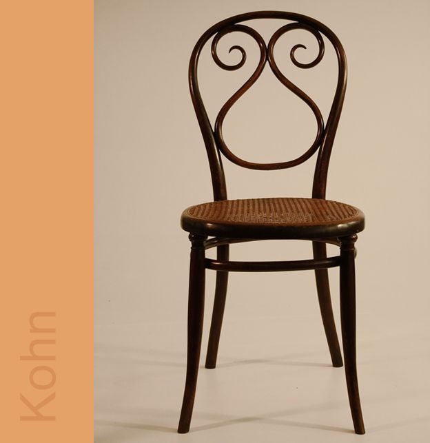 17. Sessel-Kombination aus Nr.5 und Nr.6 der Firma Jacob & Josef Kohn Wien, um 1885. Die Vorderbeine bilden einen Teil des Sitzrahmens, was eine völlig neue Konstruktion aufzeigen liess. Doch die Grundidee stammt von Thonet. Im Unterschied zum Modell von Thonet setzte Kohn zum Beispiel schöne Motive wie "Herz-Formen" bei den Vorderbeinen ein. Der Fussreif wurde bei Thonet wie Kohn zusätzlich ab etwa 1870 montiert, da die Konstruktion dann doch zu schwach war. Thonet baute das Modell als Nummer 6 mit "Fischauge" oder als Nummer 5, die herkömmliche Version mit Kapitellen bei den Vorderbeinen. Der Ursprung dieser Stuhlformen steht klar bei Thonet und geht bis ins Jahr 1851 zurück. Damals wurde für die erste Weltausstellung in London 1851 sogar ein ganzes Ensemble (noch in Schichtholzverleimung) hergerichtet, das mit Messingstreifen-Einlagen die Kurven und Formen dieser neuartigen Möbelgattung noch extra-elegant betonen sollte. Diese Thonet-Möbel dienten nur zur Repräsentation und waren nicht käuflich. Modell Nr.5 und 6 wie auch Modell Nr.9 bot Thonet seriell auf seinem Verkaufsplakat von 1859 an.