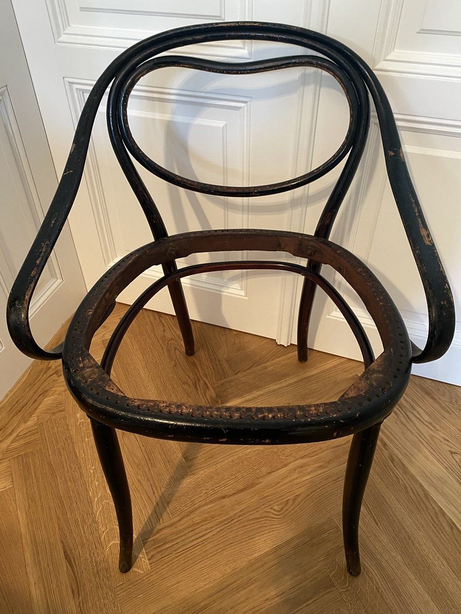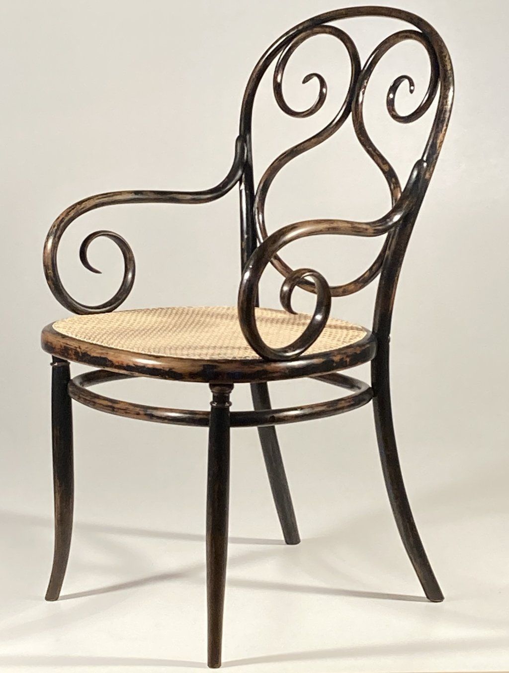 57. Thonet Sessel Nr. 21. Ein sehr sammelwürdiges Modell, das kaum im Original von Thonet zu finden ist und wenn, dann meist in sehr schlechtem Zustand, oft mit aus der Form geratener Rückenlehne oder gebrochenen Hörnchen.