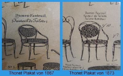30. Thonet Sessel Nr.15, frühe "steife" Rückenform mit kreisrundem Rücken-Ornament, um 1876. In keinem der bislang bekannten Thonetplakate oder Kataloge taucht der 15er in dieser Form auf. Grund dafür ist, weil bis heute noch keine Kataloge von Thonet zwischen 1873 und 1879 aufgetaucht sind. Und genau in diesem Zeitraum muss der 15er in dieser Form auf den Markt gekommen sein. Die Verstärkungsbügel von Rückenlehne zu Sitz waren etwa ab 1876 eine Neuheit und optional als zusätzliche Aussteifung erhältlich. Sehr selten sind Möbel mit "steifer Rückenform" UND Verstärkungsbügeln zu finden. In der ersten Zeit wurden die Verstärkungen noch mit sichbaren "offenen" Schrauben montiert. Später wurden die Schrauben mit Holzzapfen verdeckt.