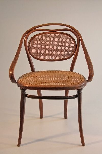 27. Sessel Nr.91 der Firma Gebrüder Thonet Wien, um 1890. Auch "Lattenstuhl" genannt. Der Entwurf solcher technischen und optischen Neuheiten ist dem Sohn August Thonet zugeschrieben. Aus einer Firmenchronik geht hervor, dass die Thonets immer wieder neuentwickelte Modelle vom Fabrikdach in den Hof warfen, um deren Haltbarkeit zu testen. Der Lattenstuhl ging zwar in Serie, konnte sich aber nicht durchsetzen. Seine offenverschraubte Konstruktionsweise wurde weiters an keinem anderen Modell angewandt. der Stuhl ist kaum zu finden, höchstens vielleicht in Spanien oder Bolivien könnte ein Original noch auftauchen -dort schien er beliebt zu sein. Aber Achtung, es gibt ihn zuhauf als plumpe neuzeitliche Nachahmung.