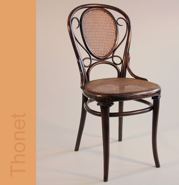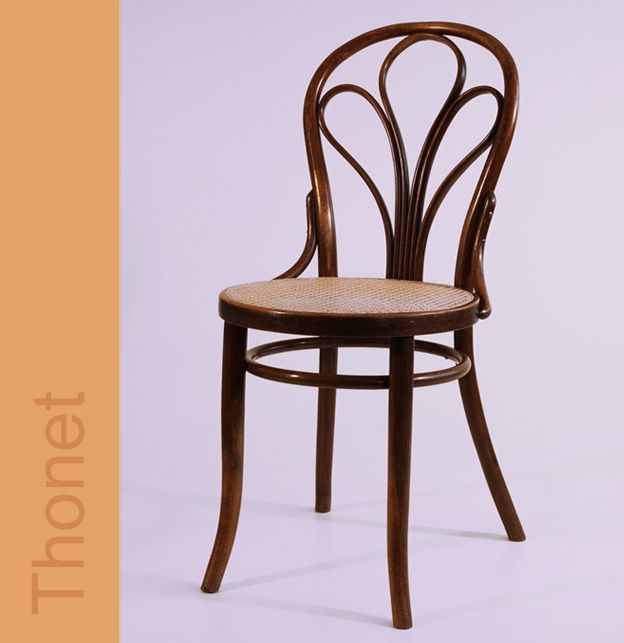 Der 14er von Thonet in seiner Formwandlung. Links: Frühe Form ab 1859. Mitte: Frühe Form, jedoch mit den ab ca. 1875 entwickelten Verstärkungs-Bügeln. Rechts: Ergonomische Grossserienform ab 1875 bis ca. 1930. Die Verstärkungsbügel gehörten nicht seriell zu den Stuhlmodellen, sie konnten bei Thonet gegen einen geringen Aufpreis bestellt werden.